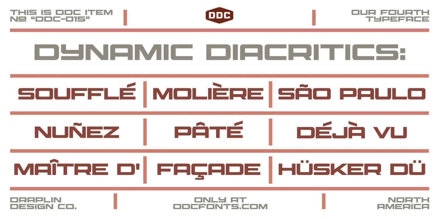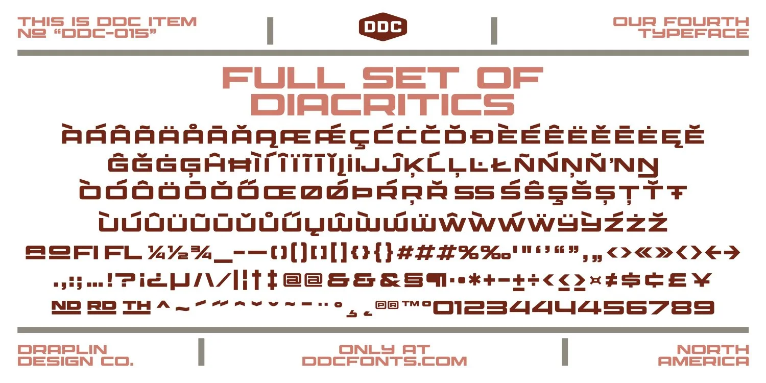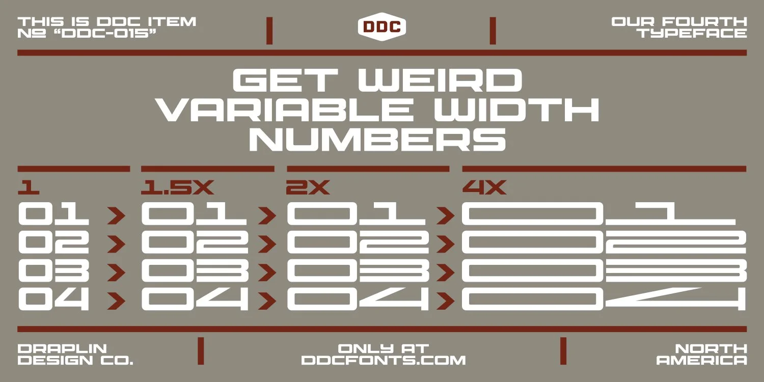 Packed with a massive 447 characters, alternate forms, infinite fractions and a full set of diacritics, it supports nearly 100 intraplanetary languages. DDC Northlock Numbers, a variable font, is included to take your numbers to the next level. What is known at this point: DDC Northlock is the typeface that goes wide...and stays there.