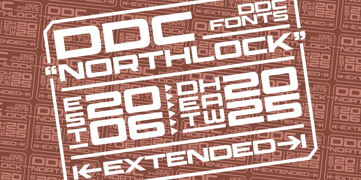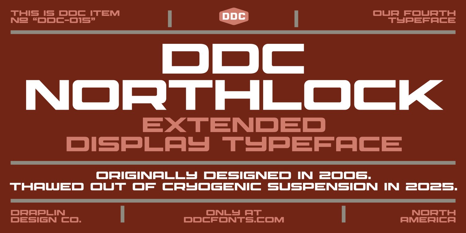 DDC Northlock is a bold, extended futuristic display typeface from DDC Fonts that leans into that rugged, industrial, space-age energy the DDC is known for. It's wide, chunky, and built with confident geometry that feels like it could be stamped on cargo crates or splashed across a retro sci-fi title card.