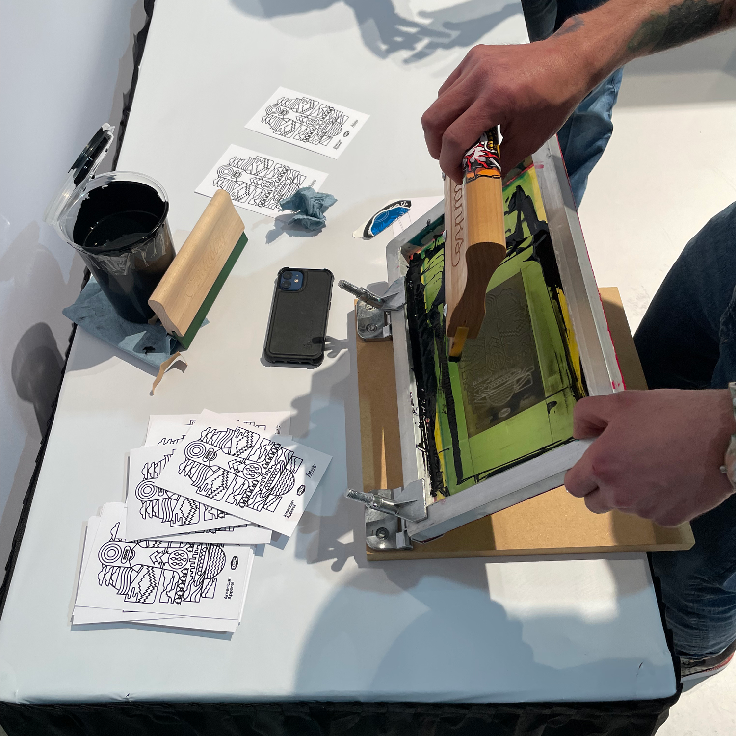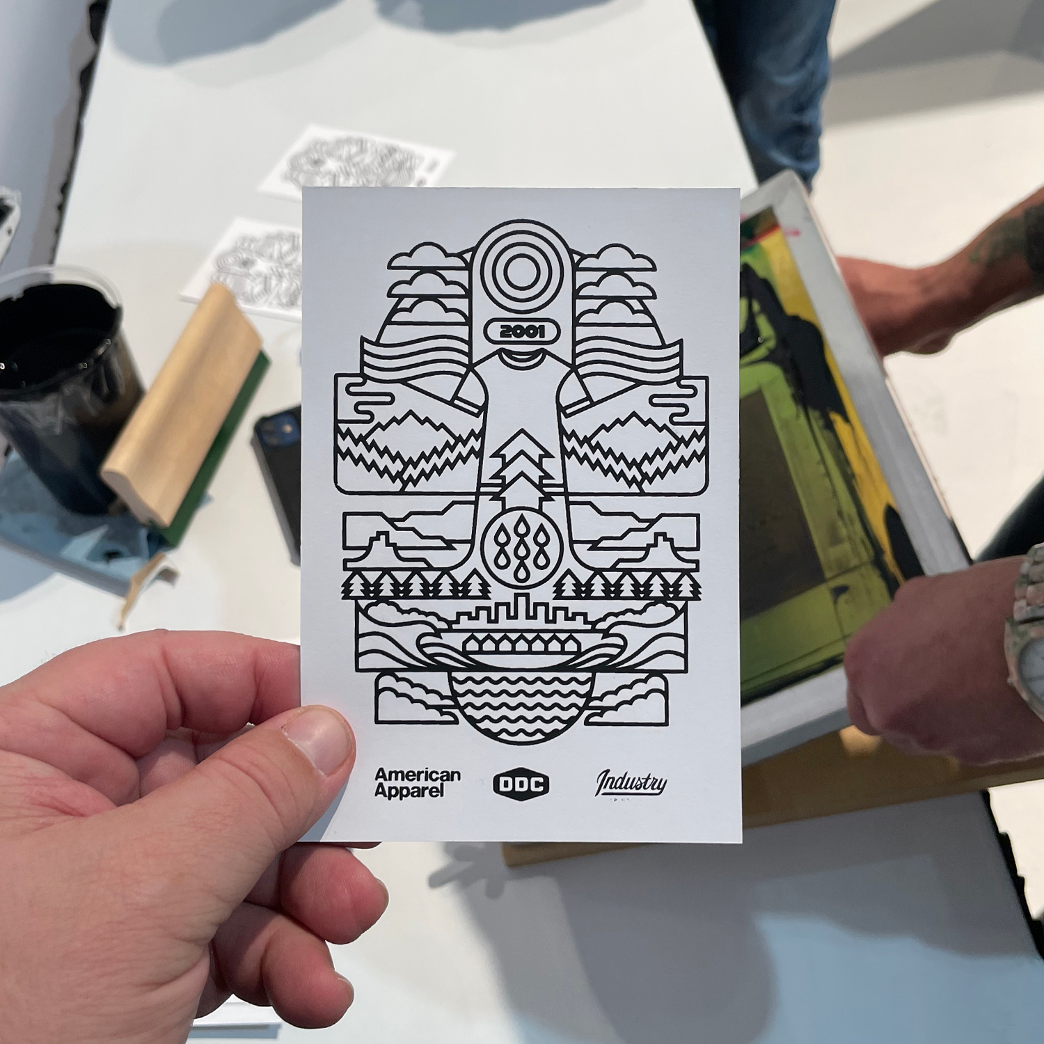 In early 2023 I got to rip down to Long Beach to appear in the American Apparel “2023 Impressions Expo” booth. Did a t-shirt graphic in conjunction with Tony Diaz from Austin’s mighty Industry Print Shop. They had a screen printing set-up for the event, along with a couple small screen for making mini prints. Had a blast with Tony, and met so many cool American Apparel folks.