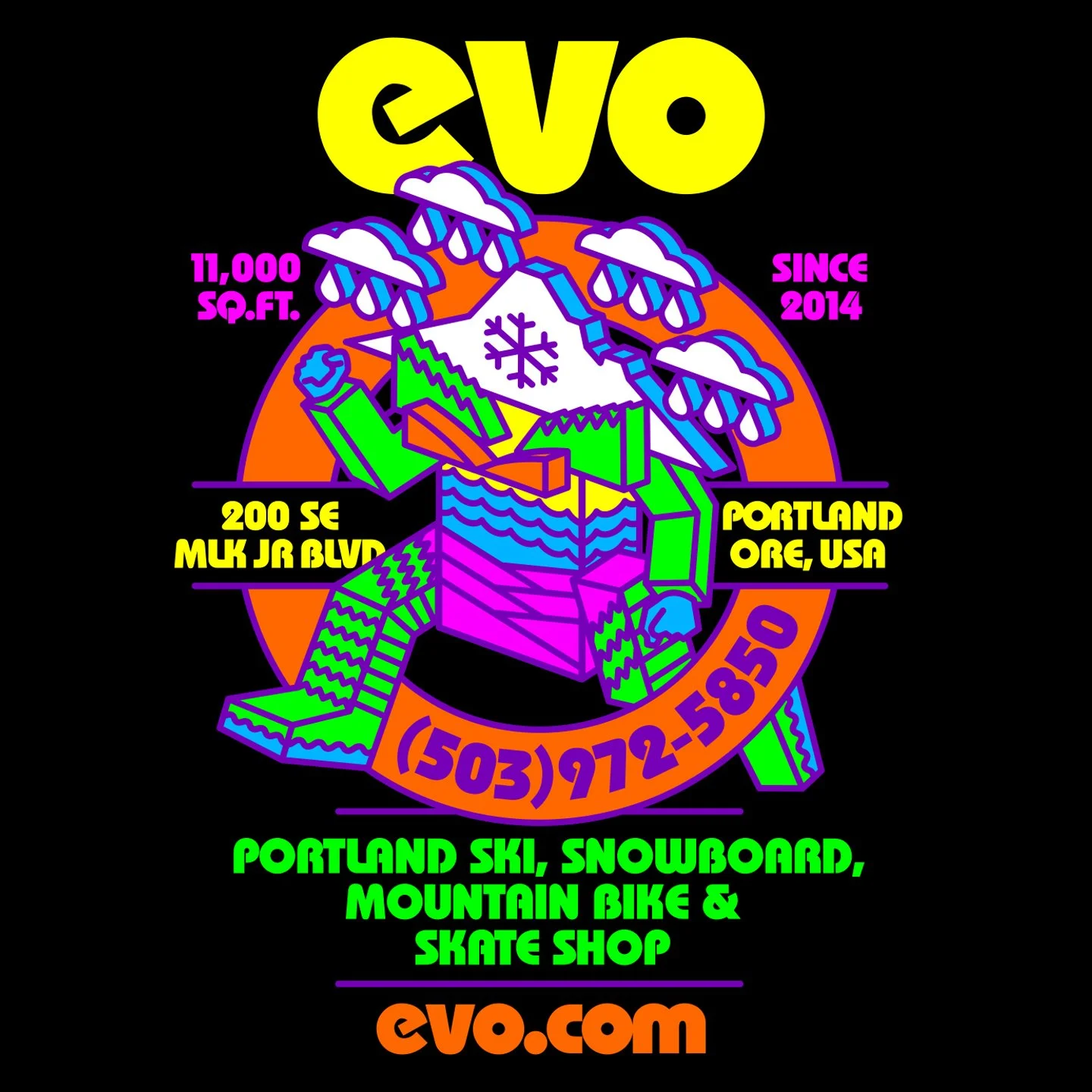 Evo has eight incredible action sports stores across the globe. Closer to home, there are three in the Northwest. One up in Seattle, one up Snoqualmie Pass and one down here in Portland. Both loaded with cool stuff from all the banger brands.
